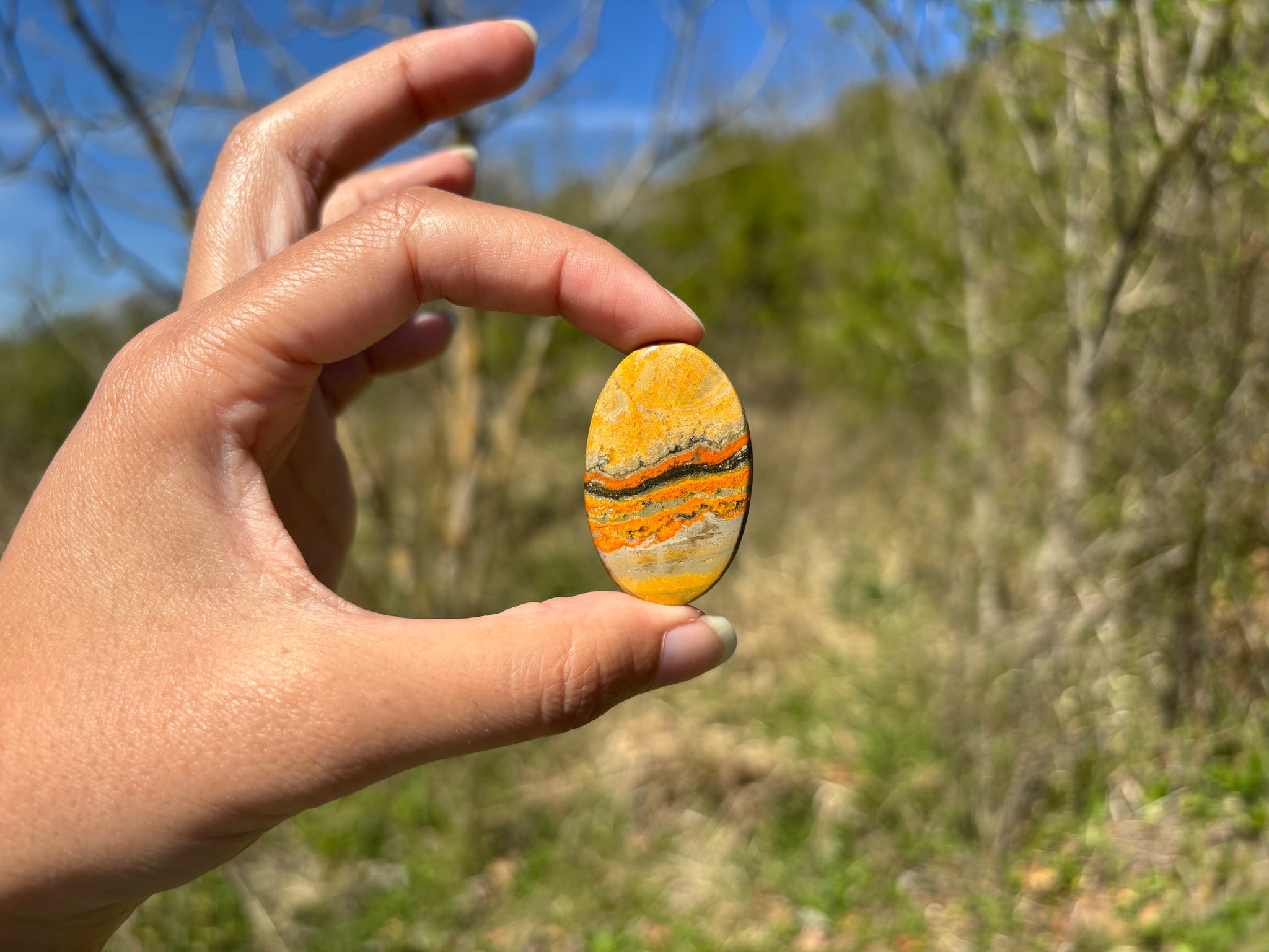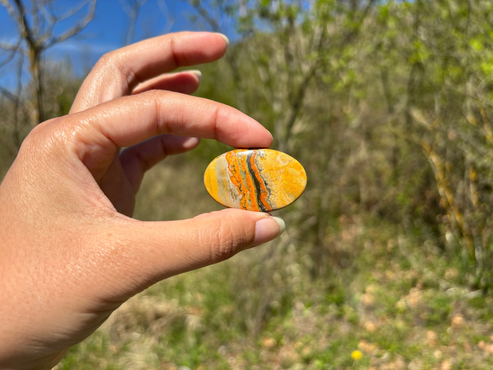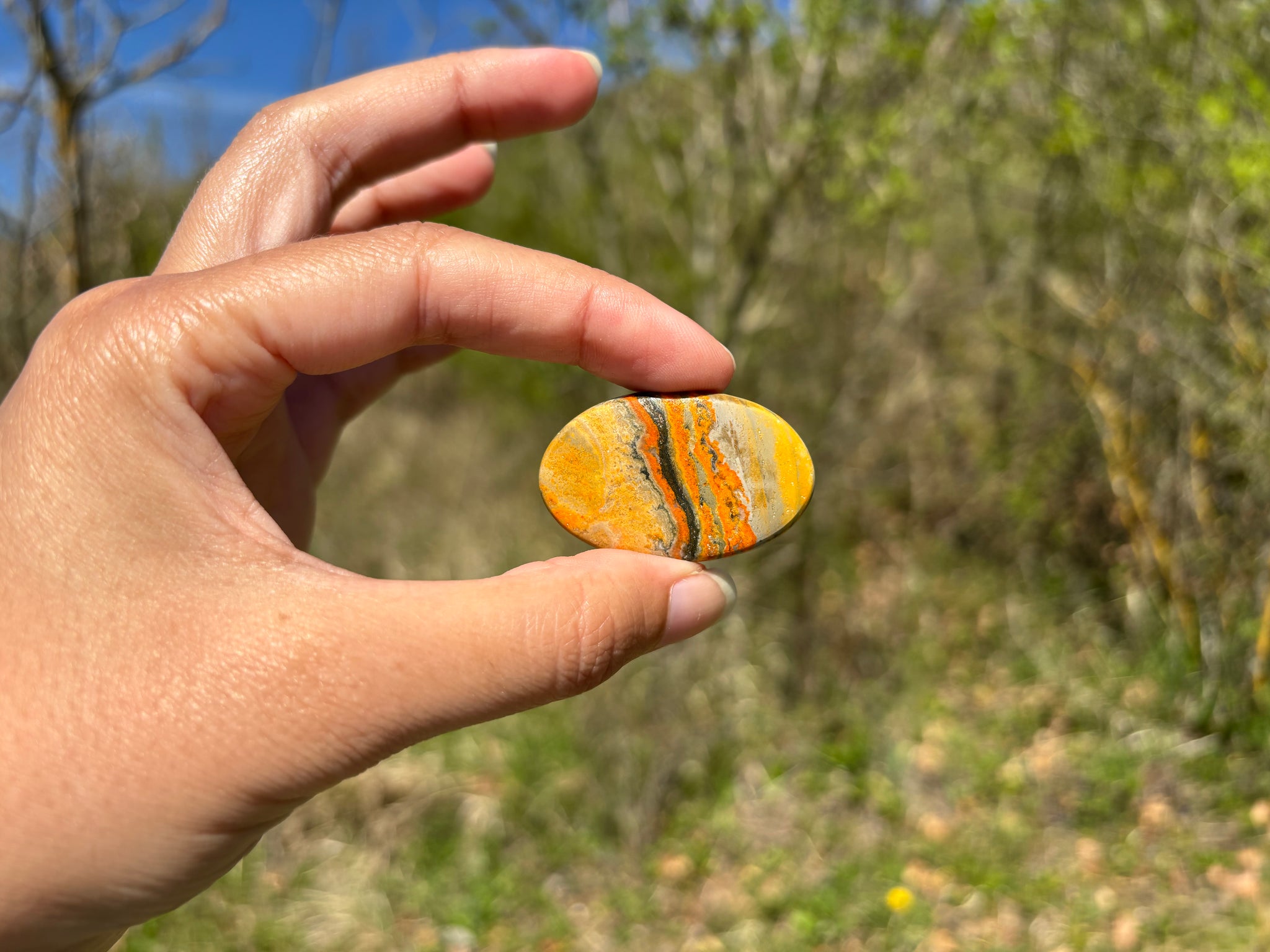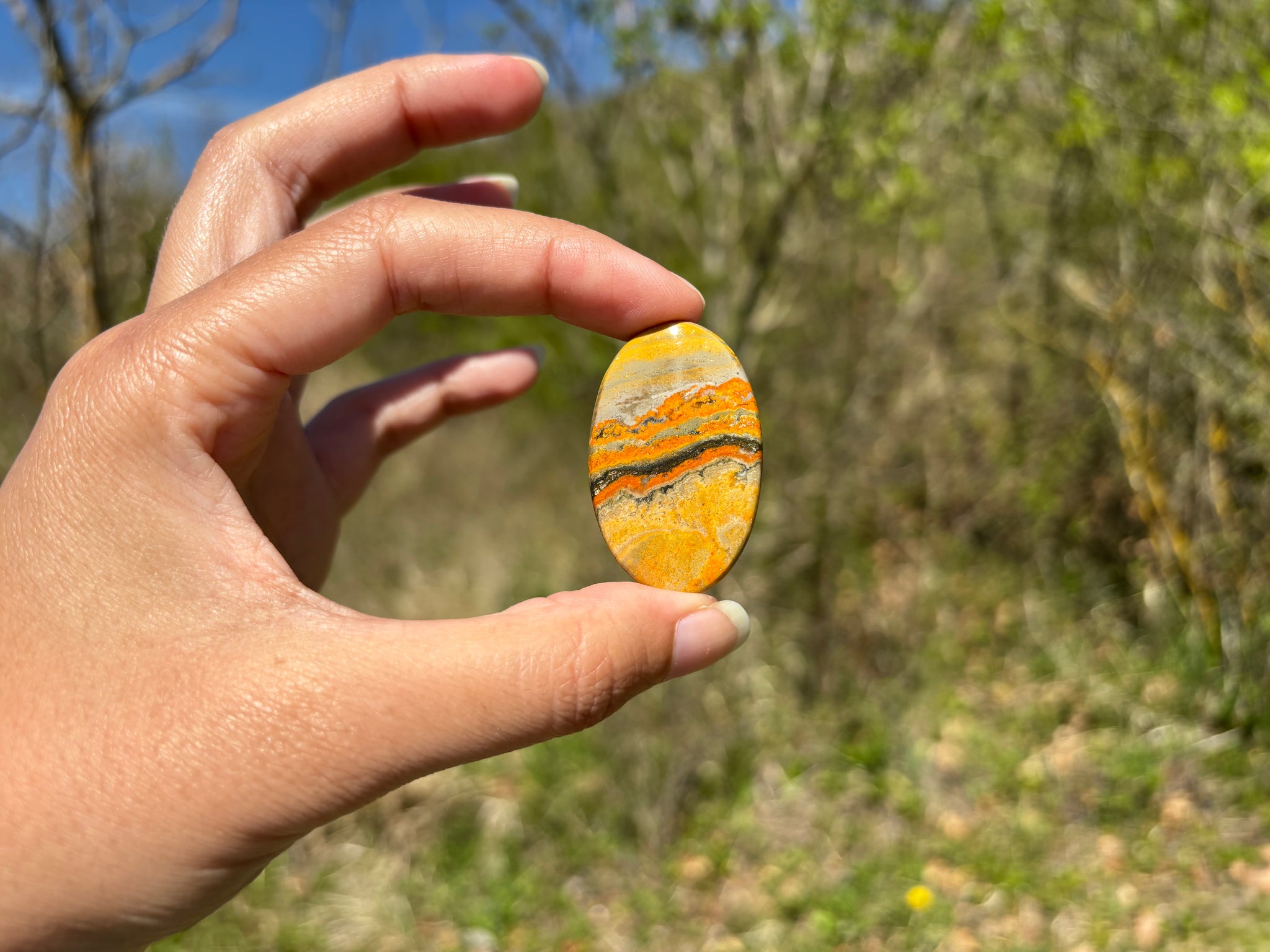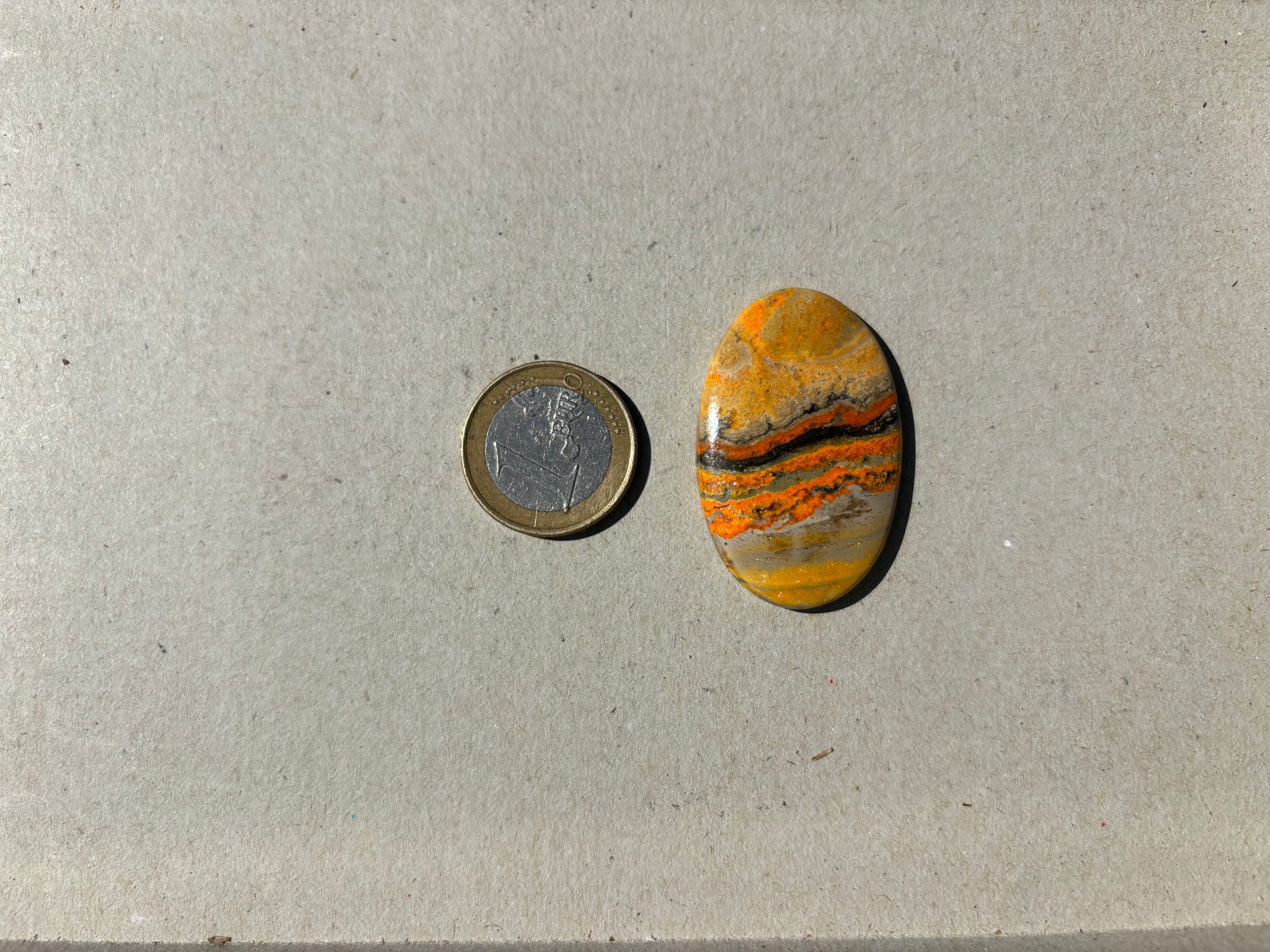 A savoir: Ce n'est pas réellement un jaspe mais il n'existe pas de catégorie pour cette roche sédimentaire. Cette roche est composée de pararéalgar (ce qui est jaune à orange) qui est un sulfure d'arsenic et de carbonate (ce qui est gris).