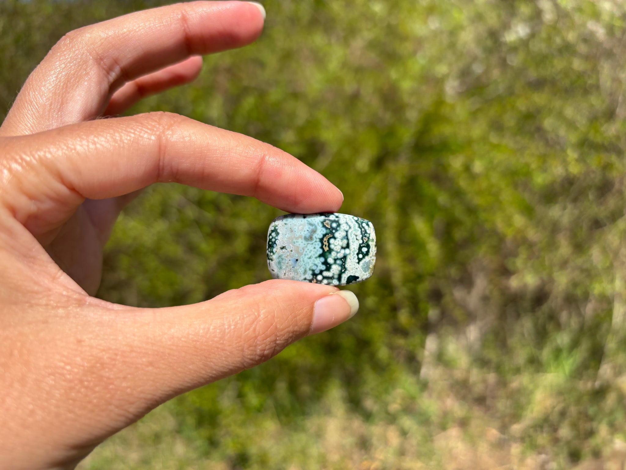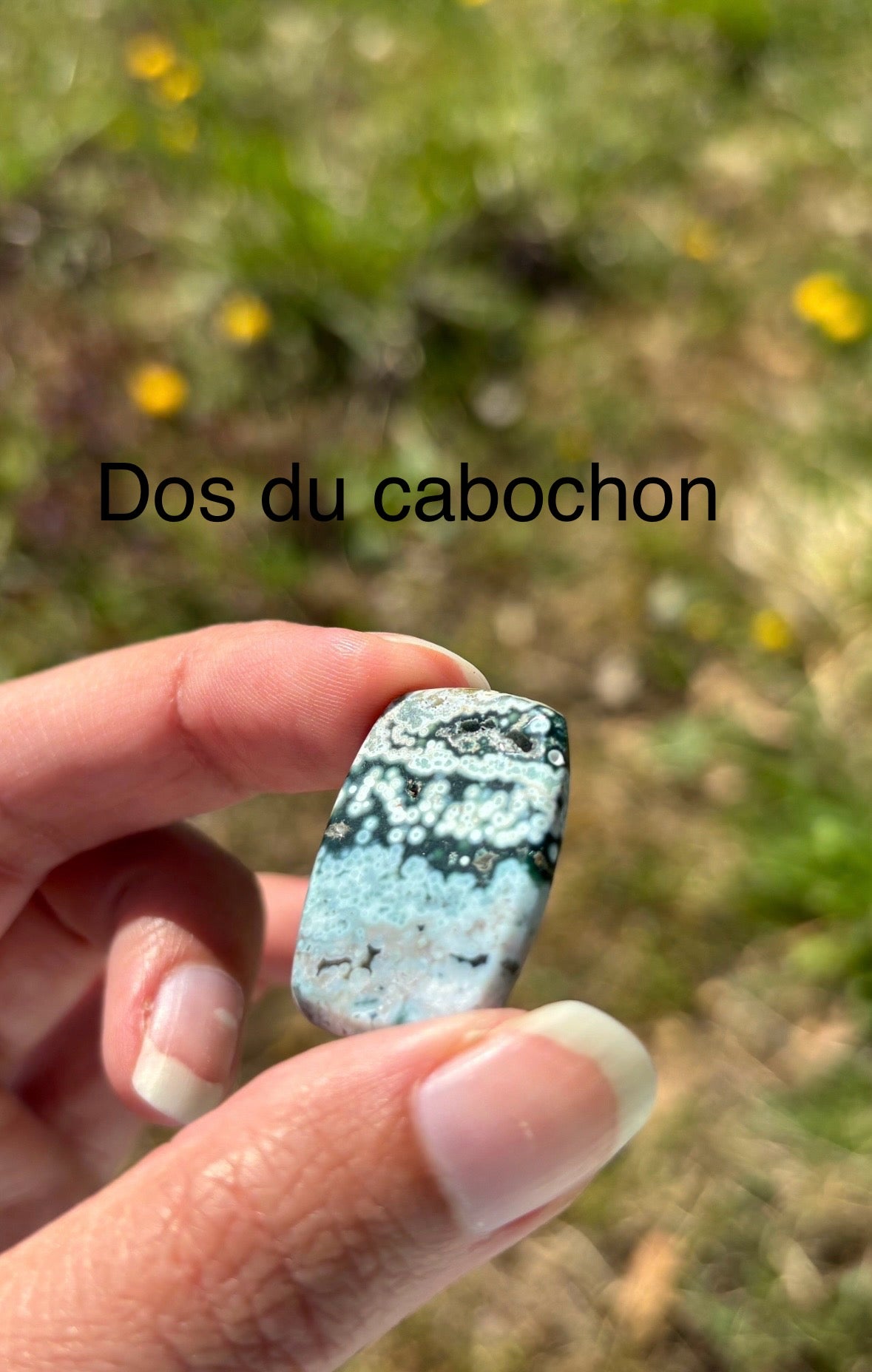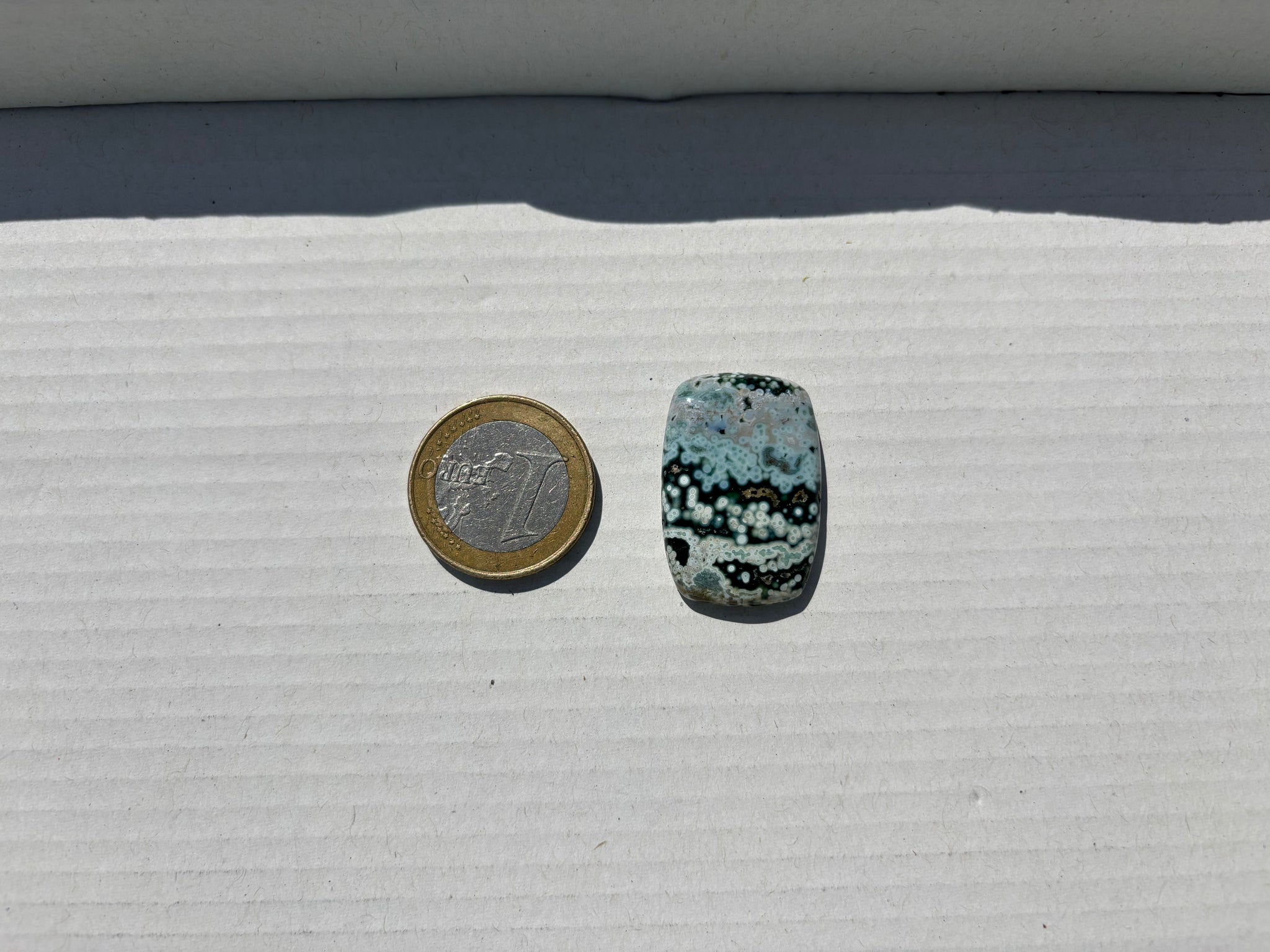 A savoir: Le jaspe océan un nom commercial pour une calcédoine spherulitic d'après les travaux de recherche du Docteur Werner Lieber. On l'appelle régulièrement jaspe orbiculaire. On y voit souvent des motifs sphériques caractéristiques.