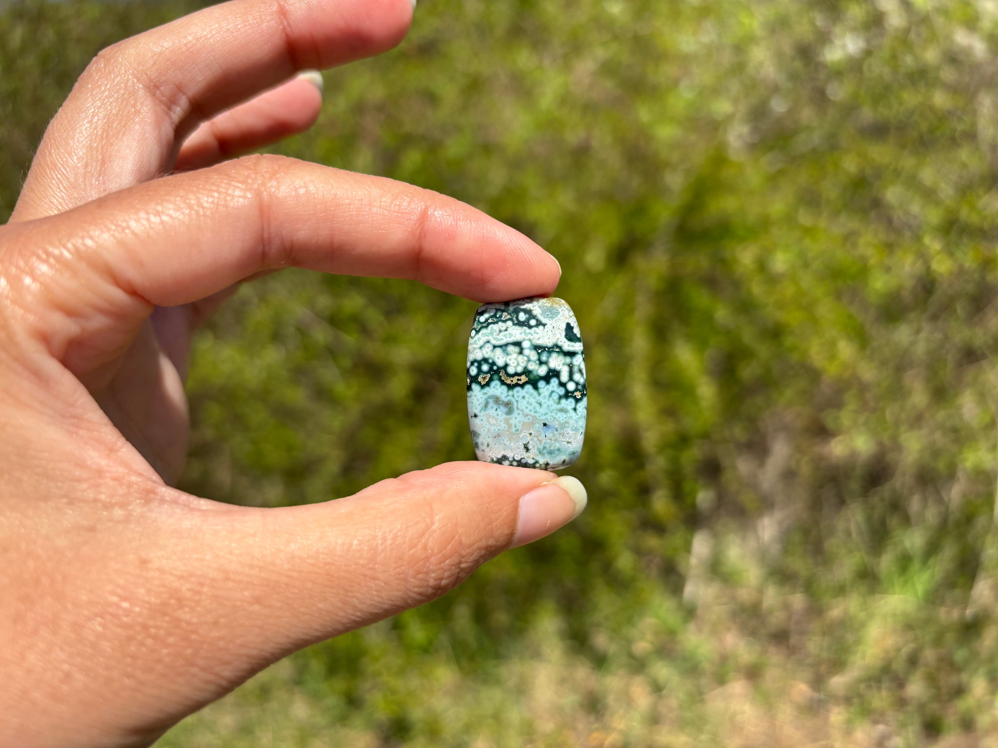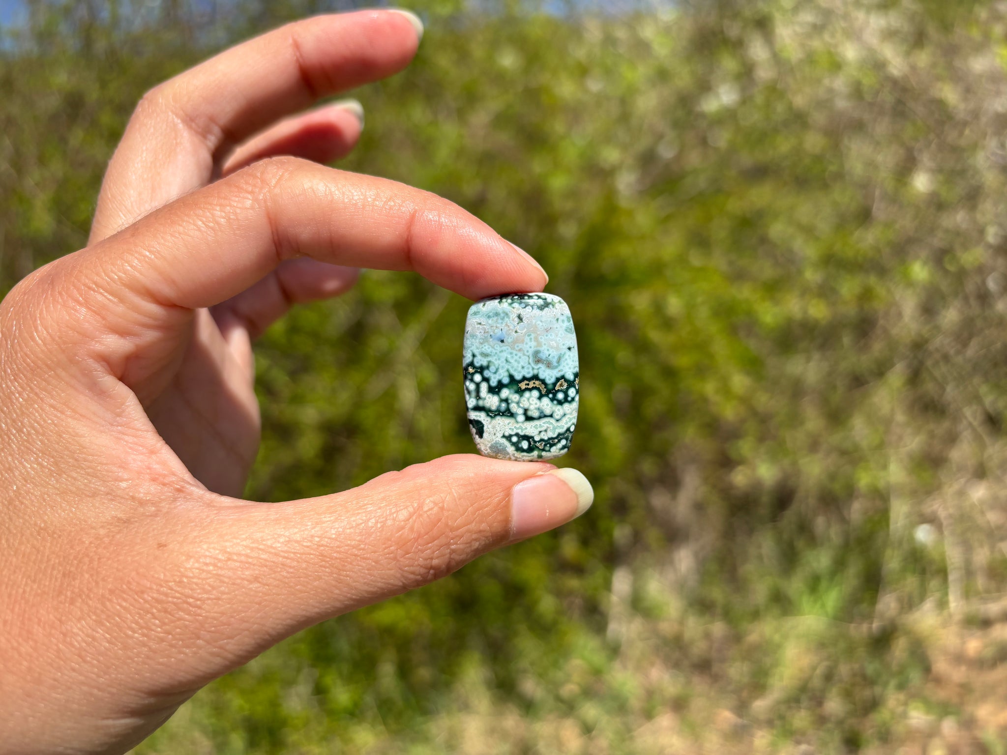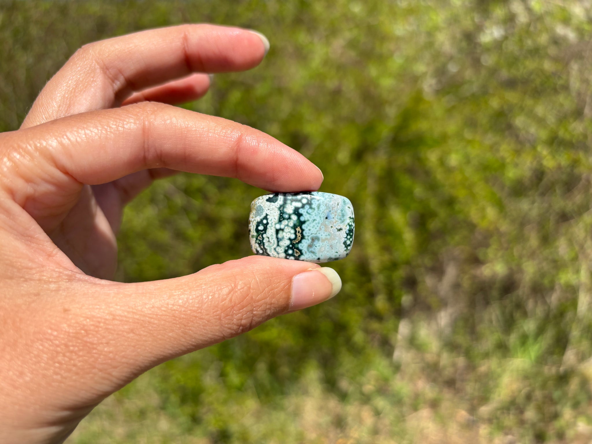 A savoir: Le jaspe océan un nom commercial pour une calcédoine spherulitic d'après les travaux de recherche du Docteur Werner Lieber. On l'appelle régulièrement jaspe orbiculaire. On y voit souvent des motifs sphériques caractéristiques.