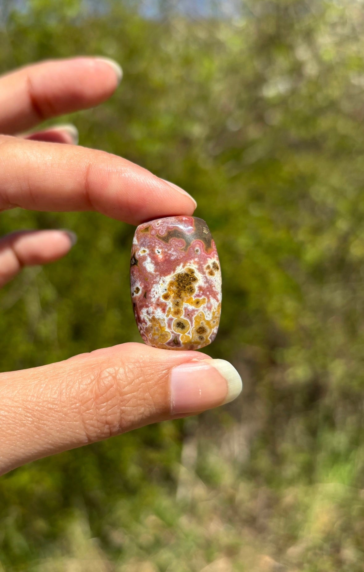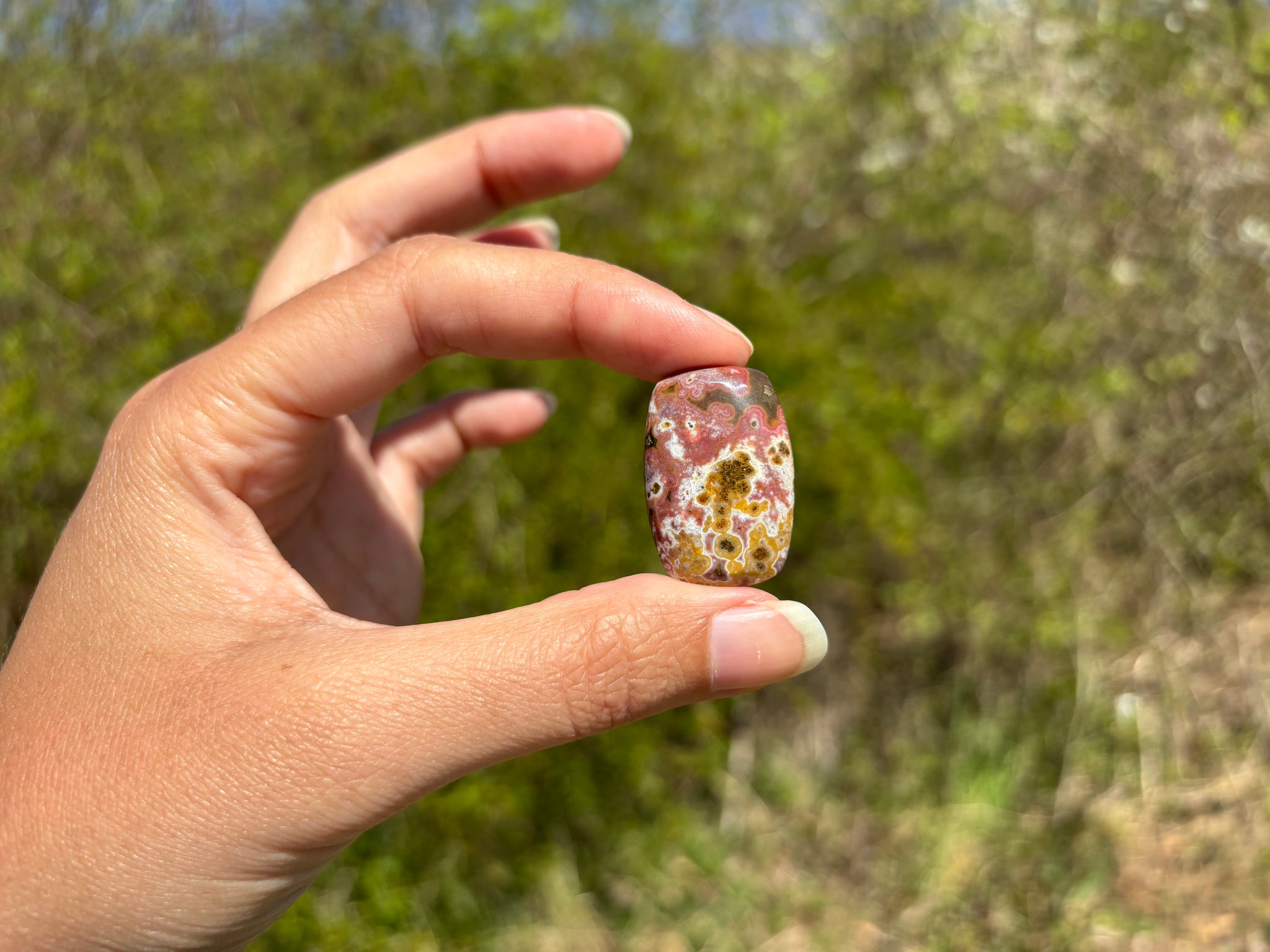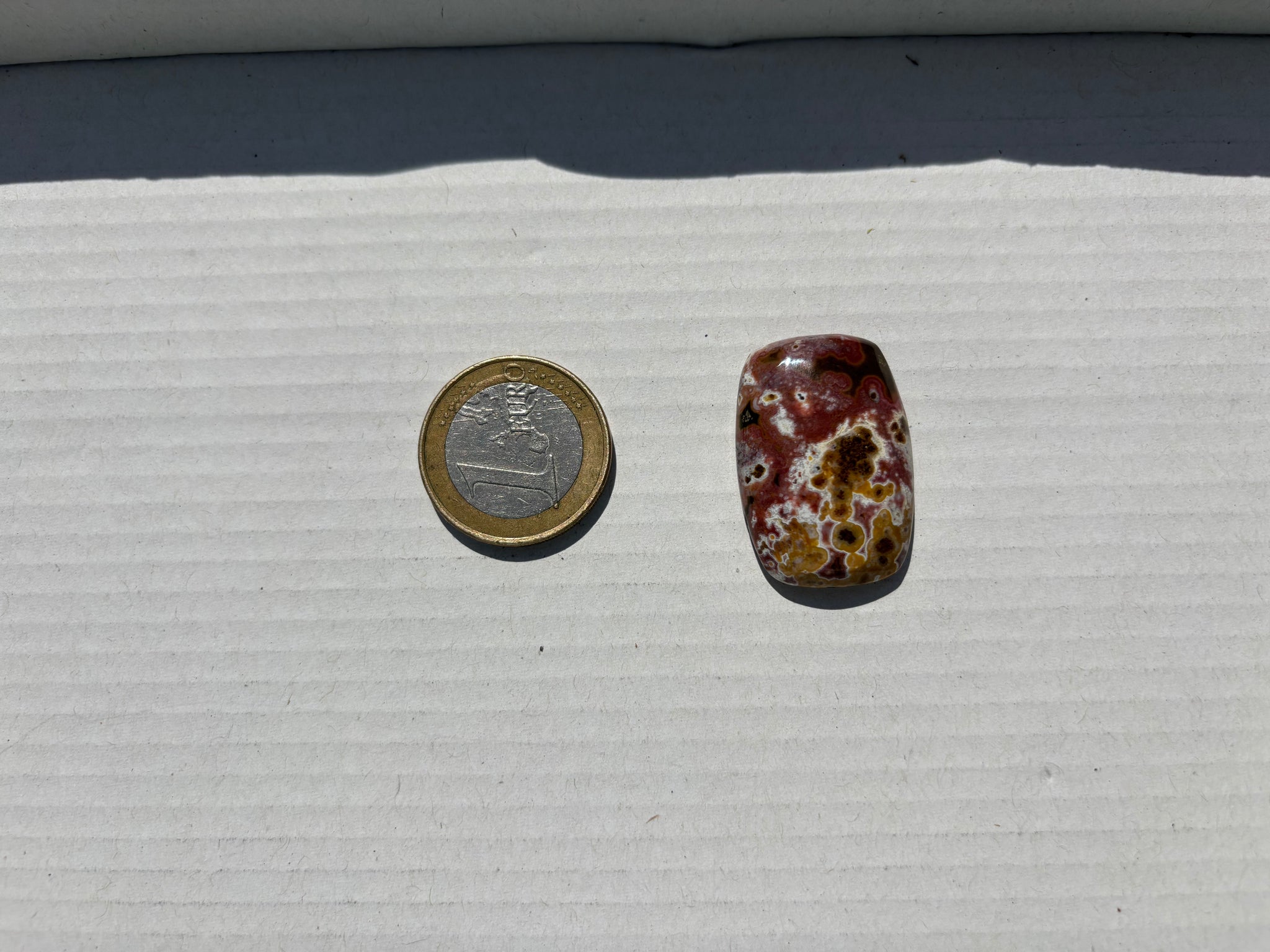 A savoir: Le jaspe océan un nom commercial pour une calcédoine spherulitic d'après les travaux de recherche du Docteur Werner Lieber. On l'appelle régulièrement jaspe orbiculaire. On y voit souvent des motifs sphériques caractéristiques.