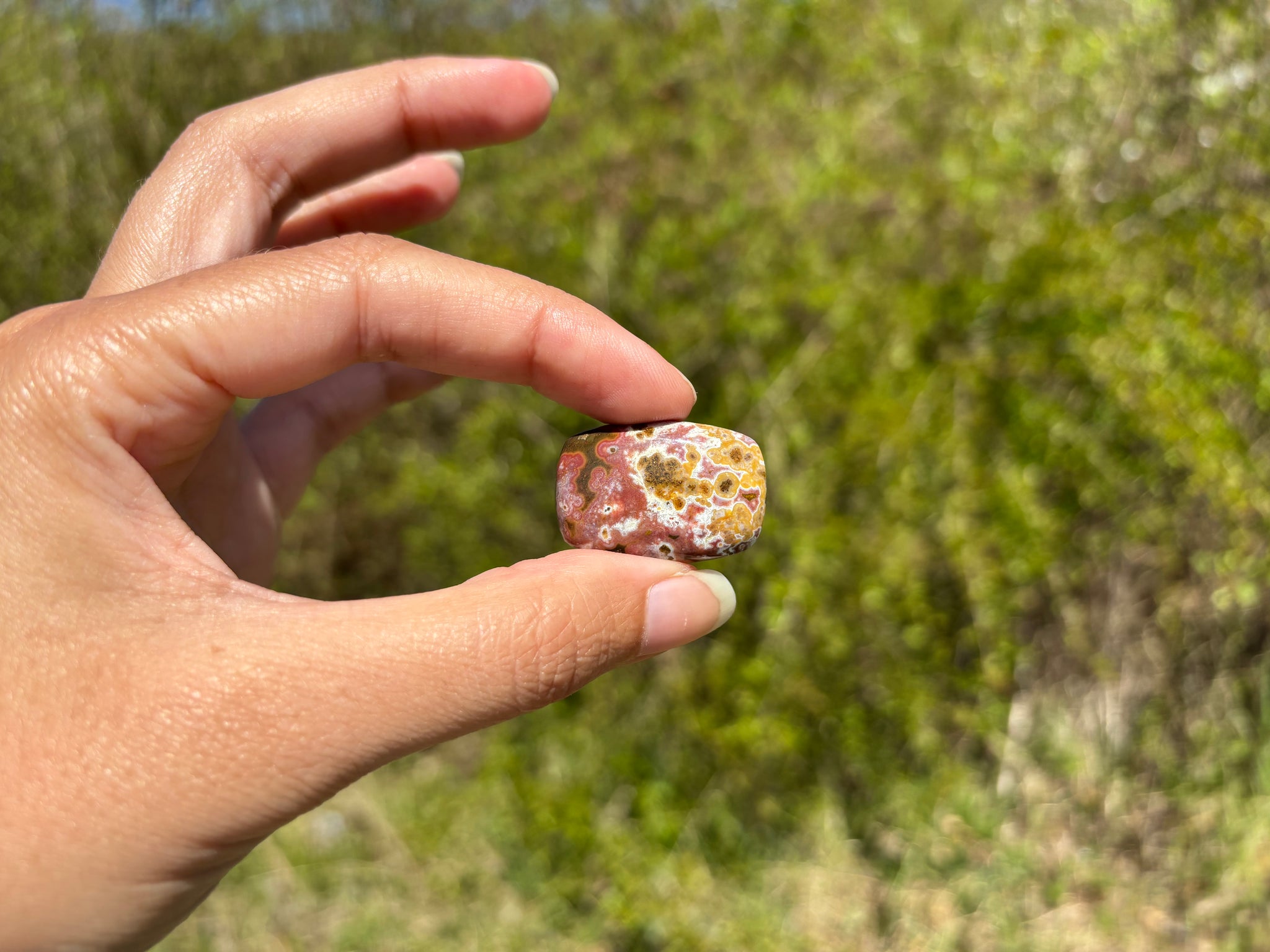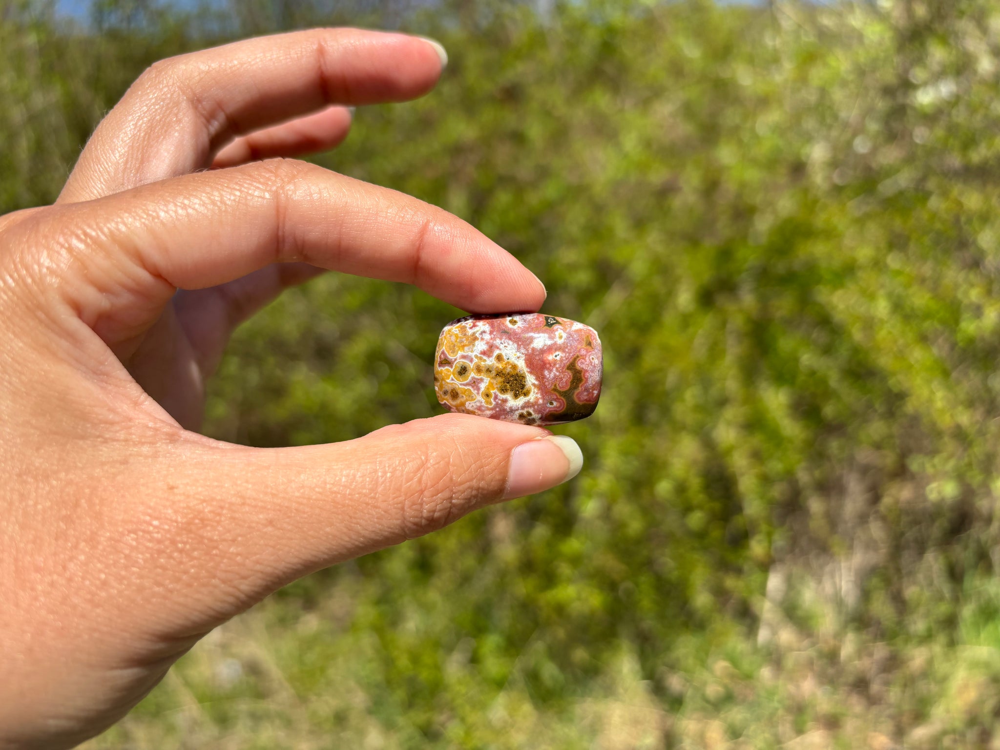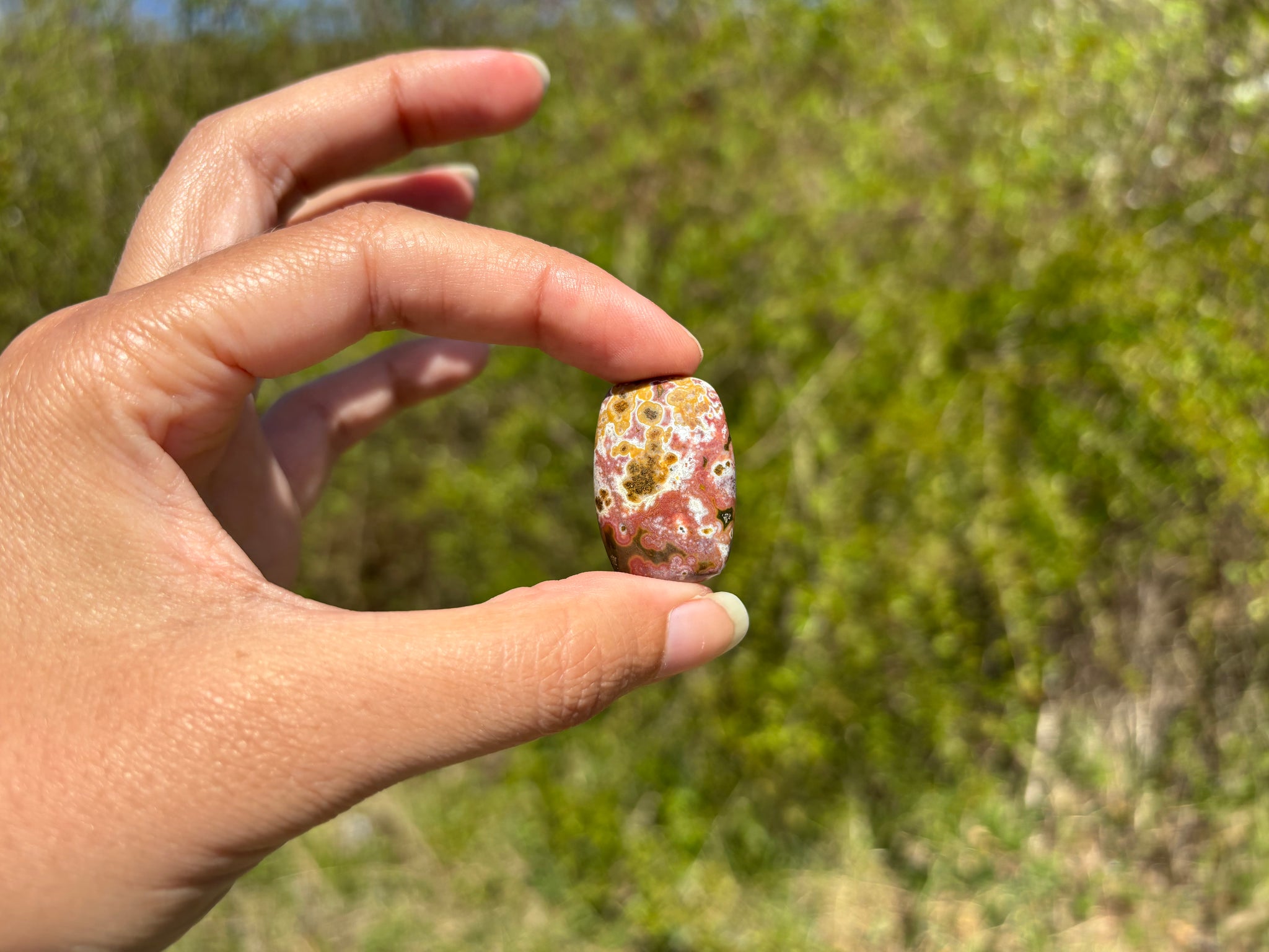 A savoir: Le jaspe océan un nom commercial pour une calcédoine spherulitic d'après les travaux de recherche du Docteur Werner Lieber. On l'appelle régulièrement jaspe orbiculaire. On y voit souvent des motifs sphériques caractéristiques.