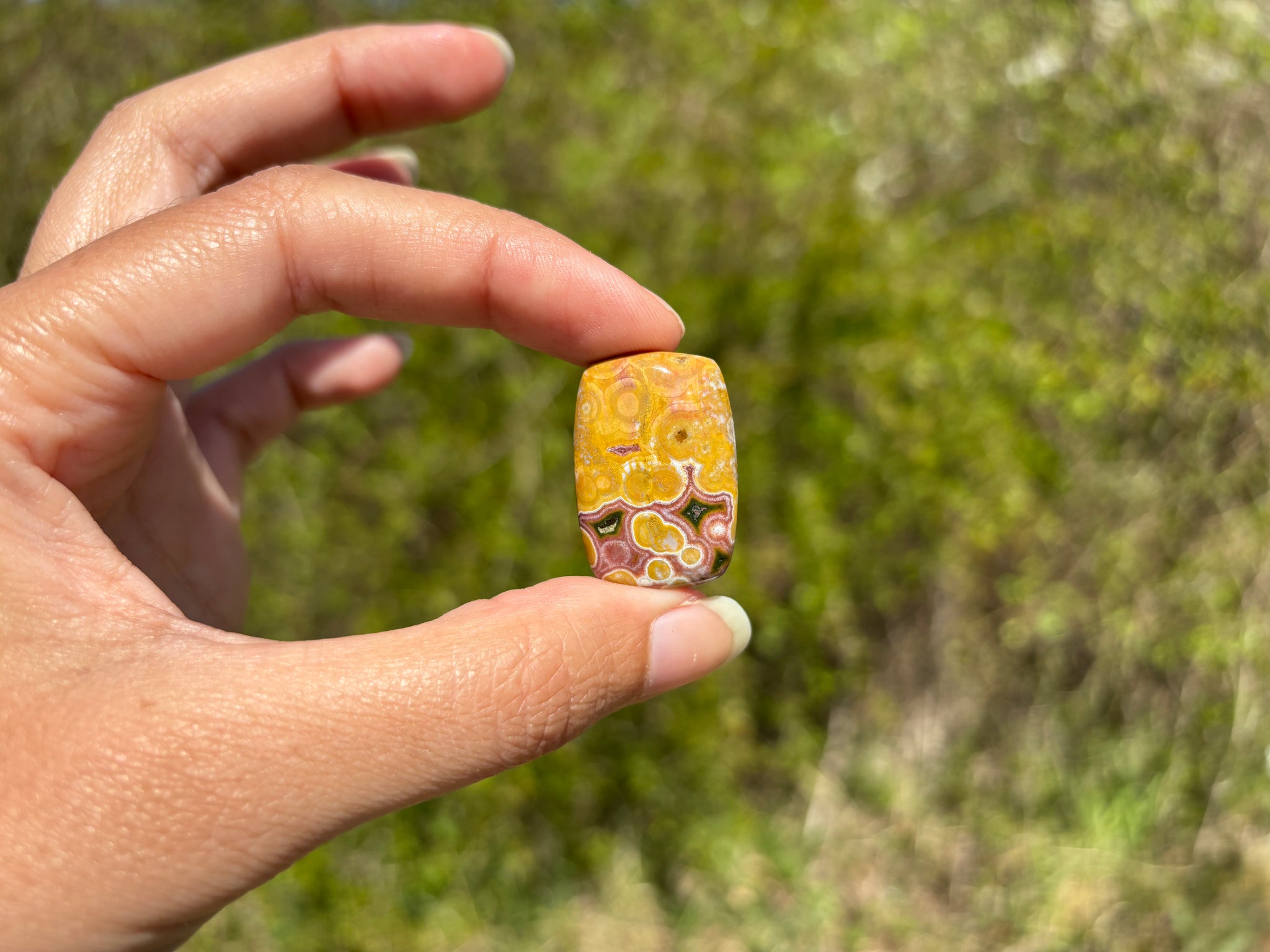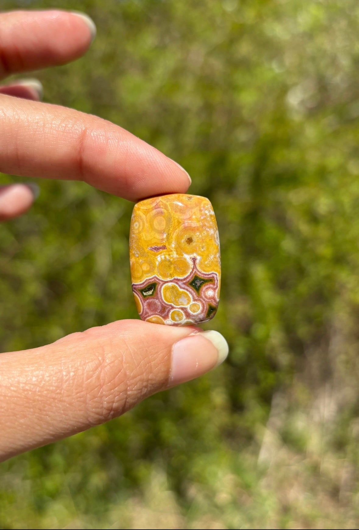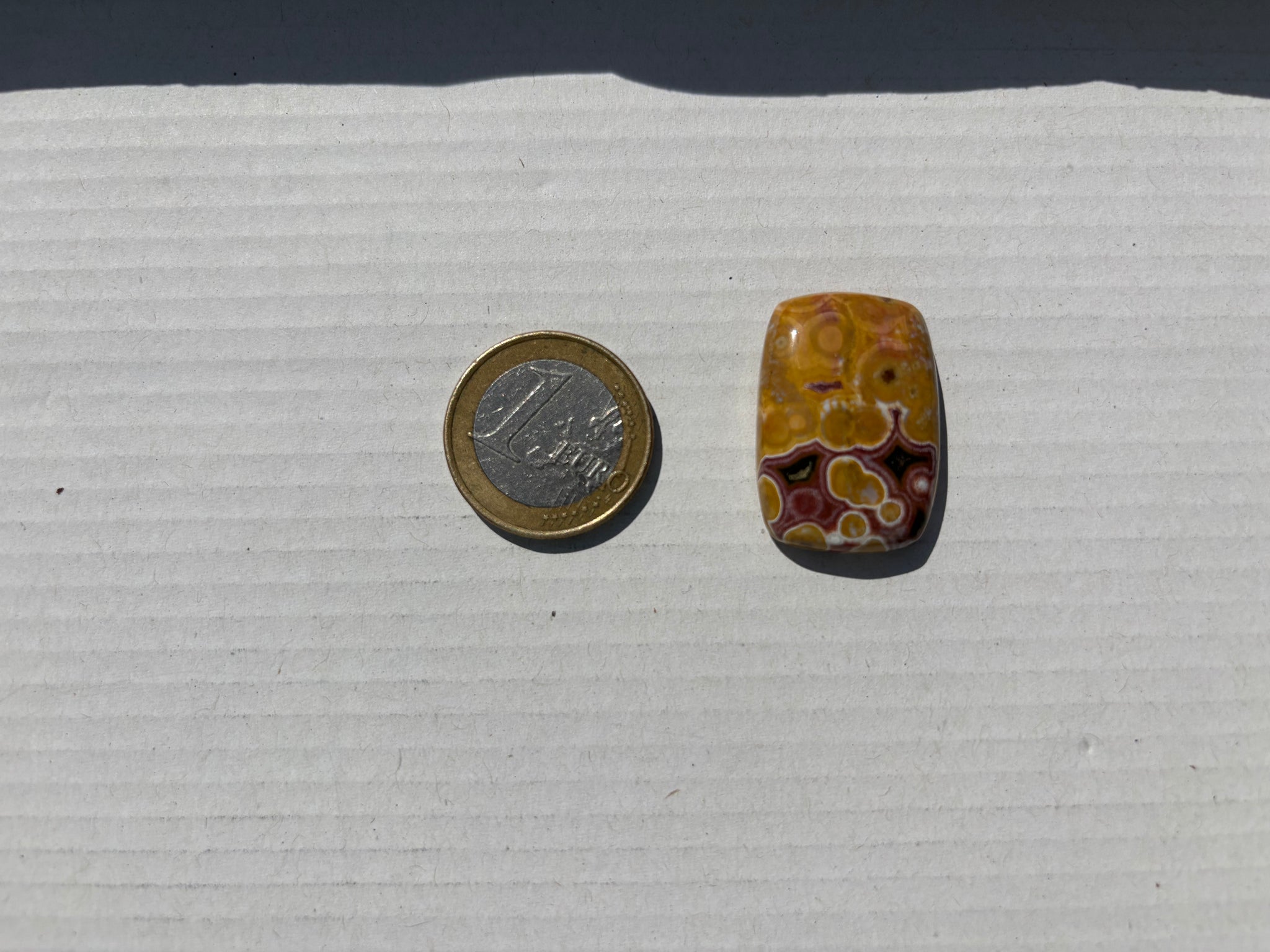 A savoir: Le jaspe océan un nom commercial pour une calcédoine spherulitic d'après les travaux de recherche du Docteur Werner Lieber. On l'appelle régulièrement jaspe orbiculaire. On y voit souvent des motifs sphériques caractéristiques.