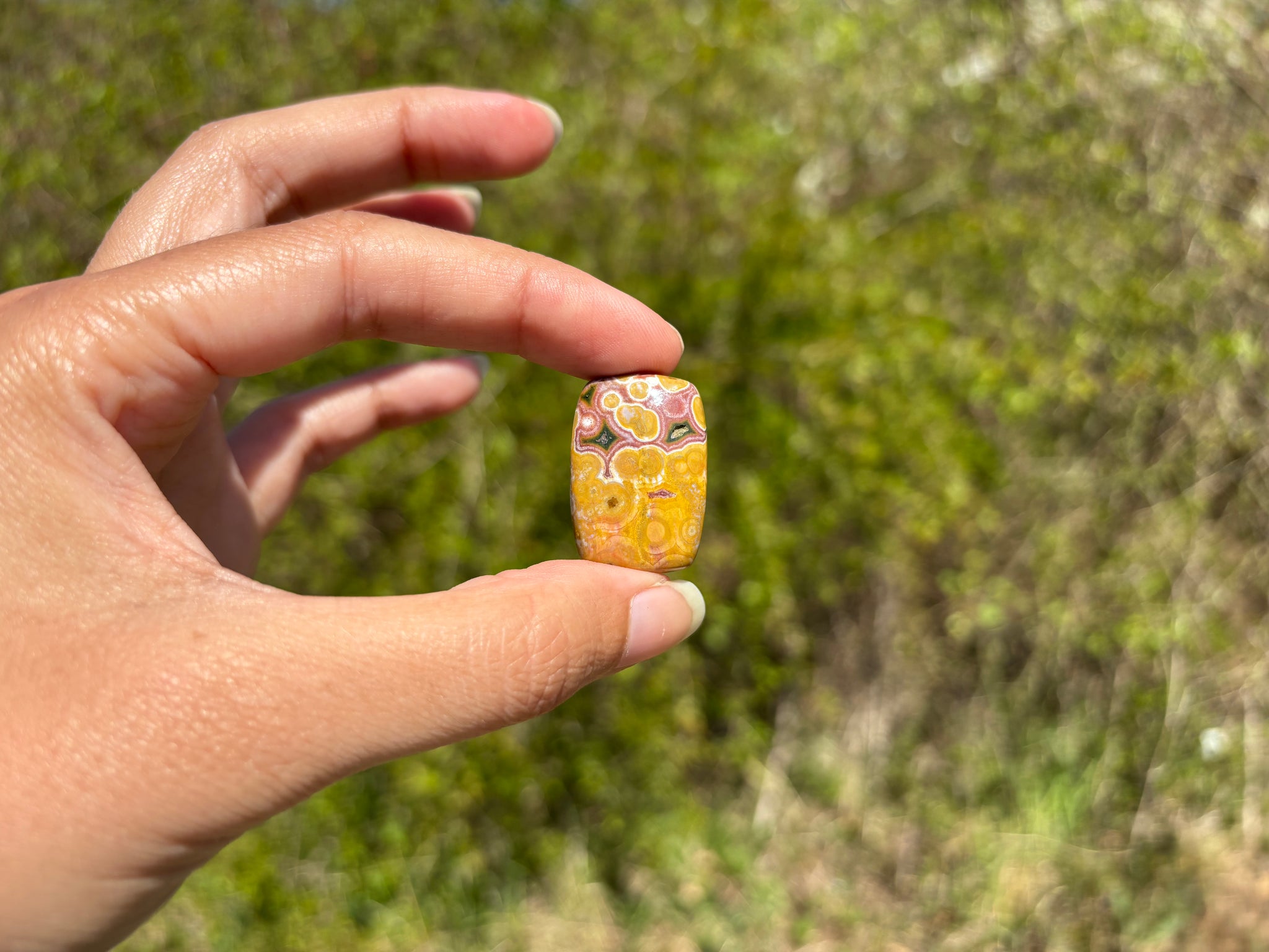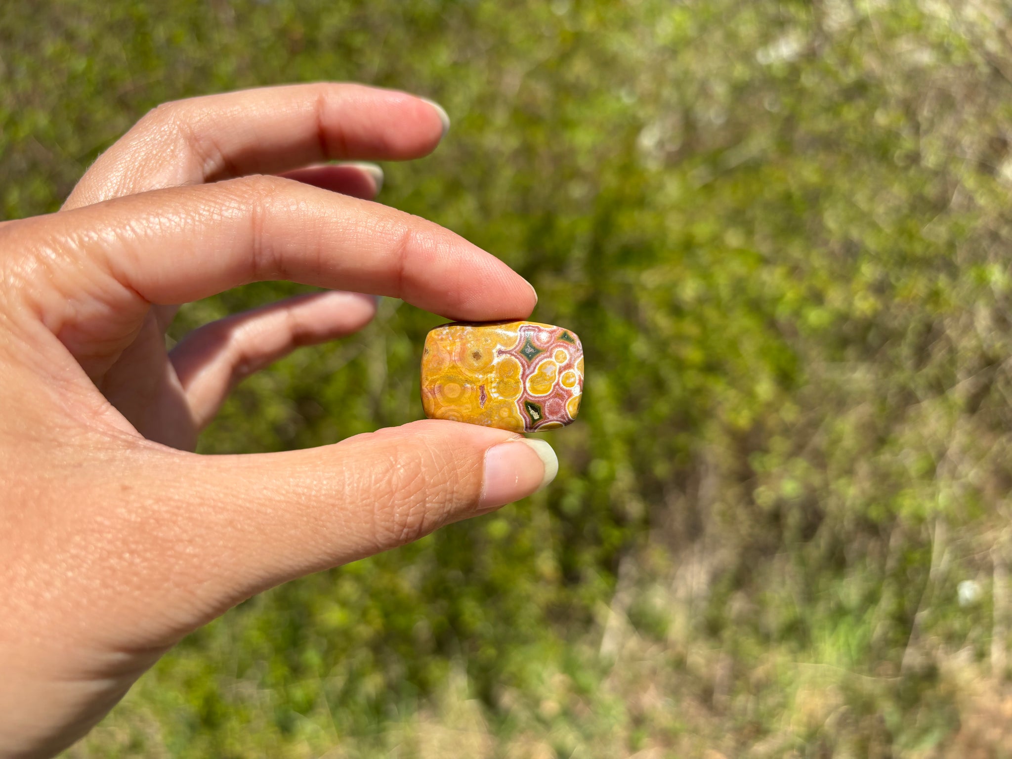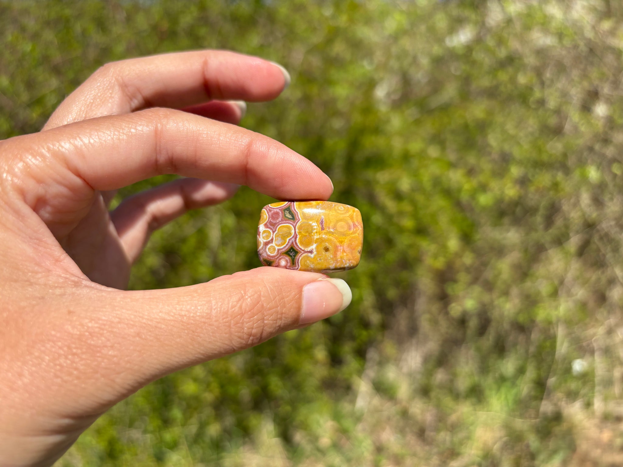 A savoir: Le jaspe océan un nom commercial pour une calcédoine spherulitic d'après les travaux de recherche du Docteur Werner Lieber. On l'appelle régulièrement jaspe orbiculaire. On y voit souvent des motifs sphériques caractéristiques.
