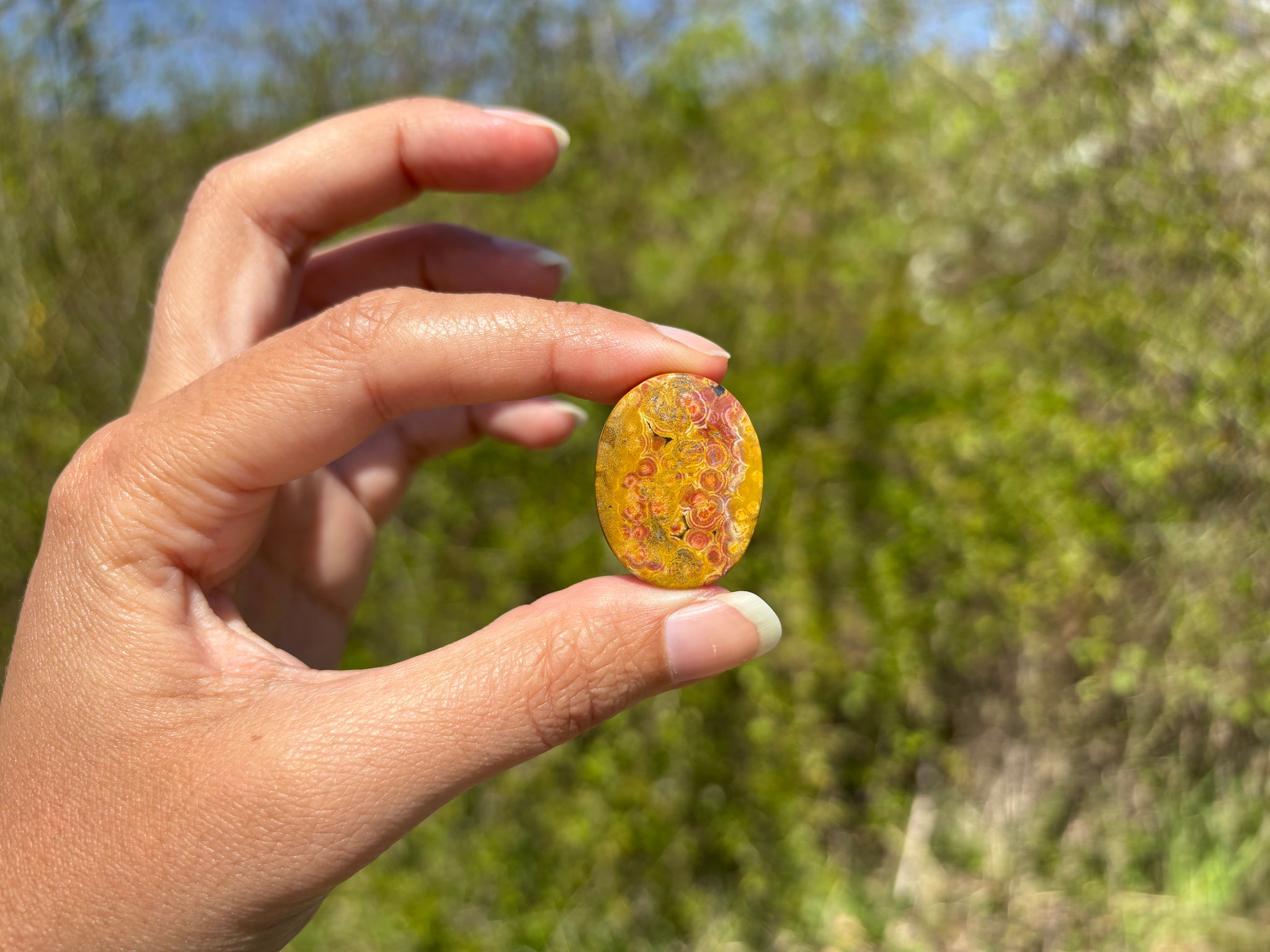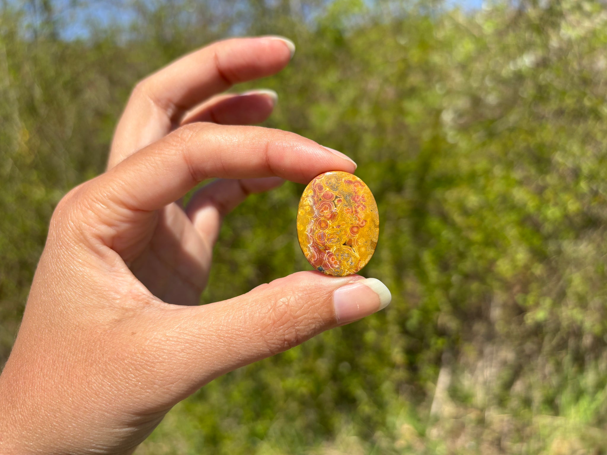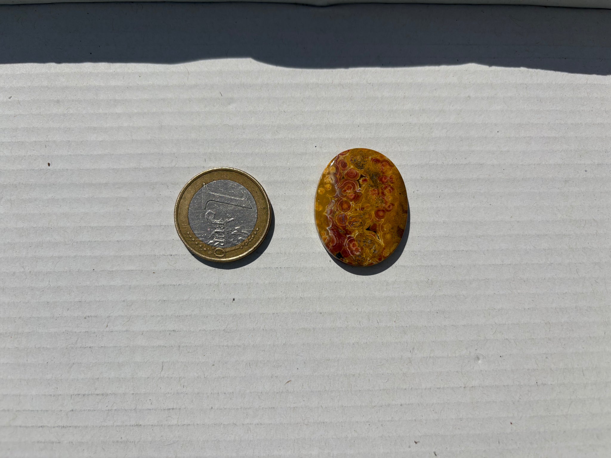 A savoir: Le jaspe océan un nom commercial pour une calcédoine spherulitic d'après les travaux de recherche du Docteur Werner Lieber. On l'appelle régulièrement jaspe orbiculaire. On y voit souvent des motifs sphériques caractéristiques.