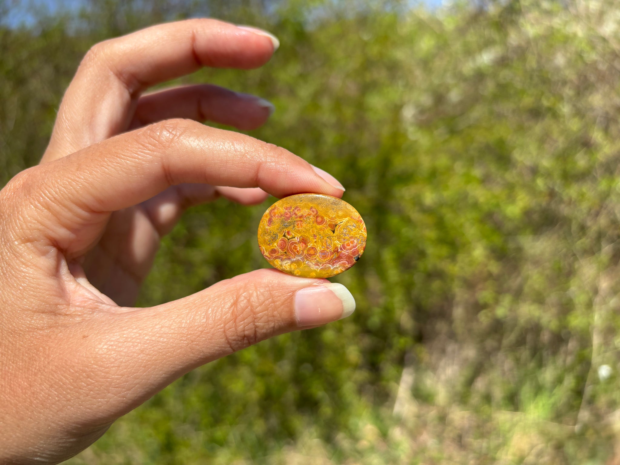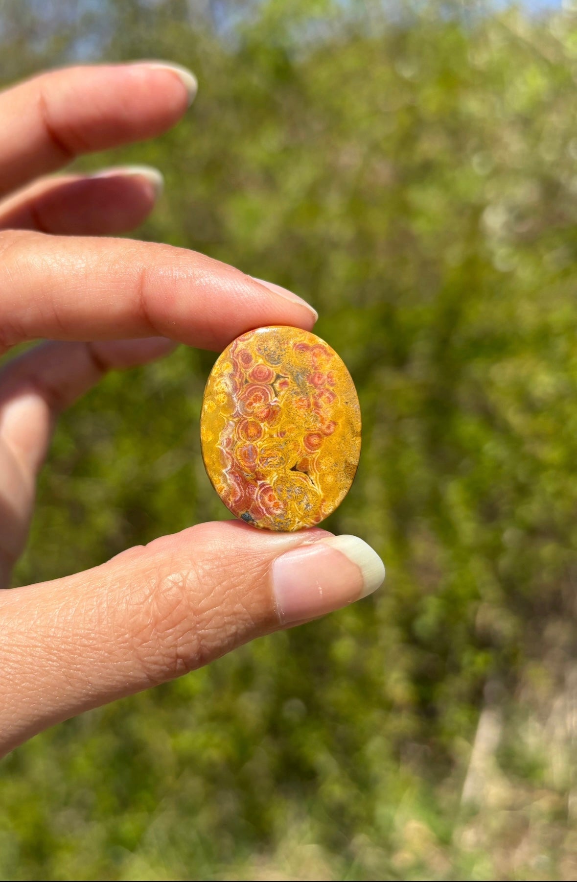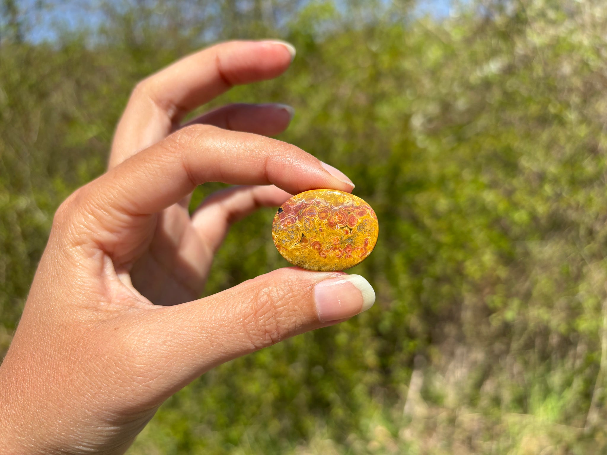 A savoir: Le jaspe océan un nom commercial pour une calcédoine spherulitic d'après les travaux de recherche du Docteur Werner Lieber. On l'appelle régulièrement jaspe orbiculaire. On y voit souvent des motifs sphériques caractéristiques.